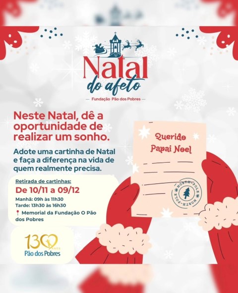 A Fundação O Pão dos Pobres deu início a uma das ações mais esperadas do ano com a campanha de adoção das cartinhas de Natal. Escritas pelos atendidos, elas trazem pedidos e desejos, uma oportunidade de participar do sonho natalino de crianças e adolescentes da instituição. As cartas podem ser retiradas presencialmente até o dia 09 de dezembro de 2025 na recepção do prédio histórico da fundação localizado na Rua da República, 801 – Cidade Baixa, em Porto Alegre. Observando os horários informados no site e redes sociais.