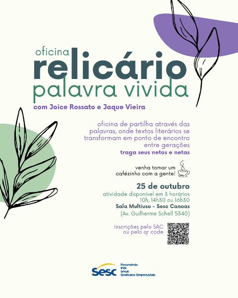 Inscrições: Gratuitas, no formulário https://forms.office.com/r/3cKLD88Sur, no Sesc Canoas ou pelo telefone/WhatsApp (51) 3456-2013