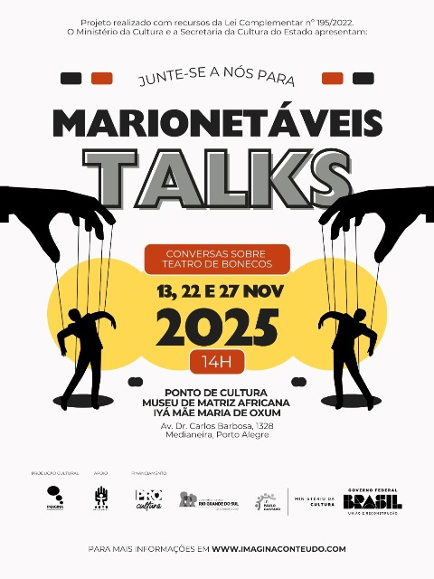 O projeto Marionetáveis – História e Mapeamento do Teatro de Bonecos do Rio Grande do Sul promove nos dias 13, 22 e 27 de novembro encontros com artistas e grupos bonequeiros da cena gaúcha. Serão realizadas rodas de conversa com gravação de depoimentos para o projeto no Museu de Matriz Africana Iya Mãe Maria de Oxum (Rua Carlos Barbosa, 1328 – Carlos Barbosa). A programação do Marionetáveis Talks é aberta a todos os interessados, com entrada franca e acessibilidade em Libras.