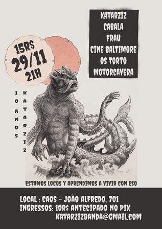 Katarziz é um grupo de punk rock formado em 2016 em Cuba e radicado em 2022 em Porto Alegre, Brasil. Para este evento especial, haverá show autoral da anfitriã e das bandas convidadas: Frau, Cine Baltimore, Motorcavera, também festejando 10 anos de carreira, e as veteranas Cabala e Os Torto.
