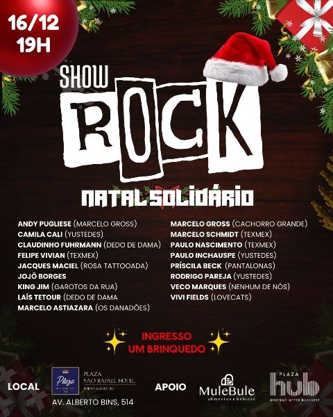 O palco do Rock Natal Solidário no Plaza São Rafael receberá participações de artistas representando bandas consagradas do rock gaúcho. Estão confirmados Andy Pugliese, da banda de Marcelo Gross; Claudinho Fuhrmann e Laís Tetour, da Dedo de Dama; Marcelo Schmidt, Felipe Vivian e Paulo Nascimento, da Texmex; Jaques Maciel, da Rosa Tattooada; Jojô Borges; King Jim, dos Garotos da Rua; Marcelo Astiazara, de Os Danadões; Paulo Inchauspe, Camila Cali e Rodrigo Pareja, da Yustedes; Marcelo Gross da Cachorro Grande; Priscila Beck das Barbarock; Vivi Fields da LoveCats; e Veco Marques, do Nenhum de Nós. “O show Rock Natal Solidário vem para unir o espírito natalino à força artística. Criando um encontro de gerações e estilos. Um momento coletivo, onde a música, a memória e a solidariedade se conectam para impactar a comunidade”, adianta Marcelo Schmidt, gestor da Rede Plaza de Hotéis, um dos idealizadores do evento e músico atuante na cena local. A ação tem o apoio do Mule Bule e do Plaza HUB. As atualizações sobre o evento podem ser acompanhadas pelo Instagram do Plaza HUB.